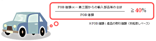 完成車について、原産地規則が「原産資格割合が40%以上であること(40%付加価値)」だった場合、日本産またはインドネシア産と認められるためには、日本国内またはインドネシア国内で生産・加工等に伴い形成された付加価値が40%以上である必要があります。