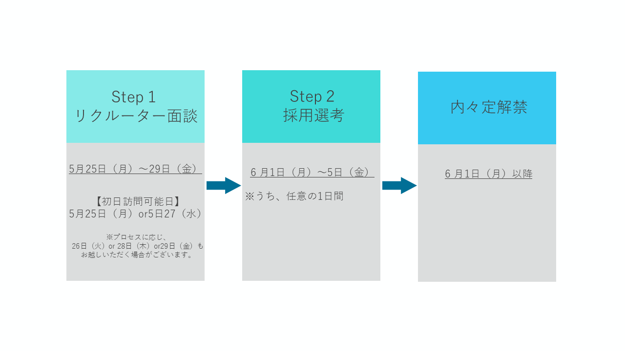 ※リクルーター面談は終日かかる場合があるため、昼食等を持参いただくことをお勧めします。
