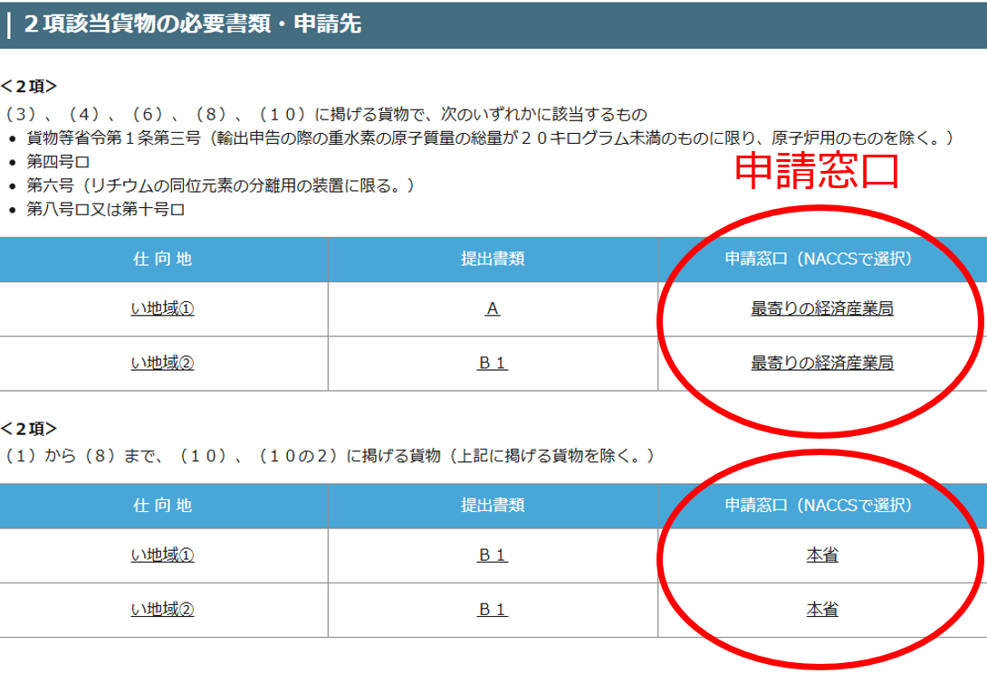 - 「2 申請書を作成する」にあたって、提出書類のページで「NACCSにおいて直接記入」と指示されている書類に相当する情報を記載していただくことになりますので、個別許可については必要書類のページでご案内した記載要領に従って記入してください。なお、申請窓口も提出書類ページで記載しているもの(本省or最寄りの地方経済産業局)を選択してください。