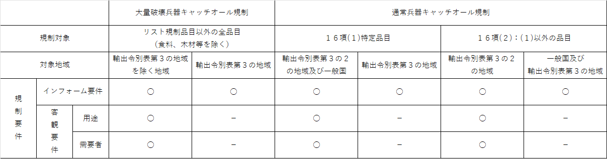 - なお、輸出令別表第3の地域向けの貨物の輸出や技術の提供については、客観要件はキャッチオール規制の対象から外れていますが、インフォーム要件は懸念国等に迂回輸出されるおそれがある場合に限定して適用されます。