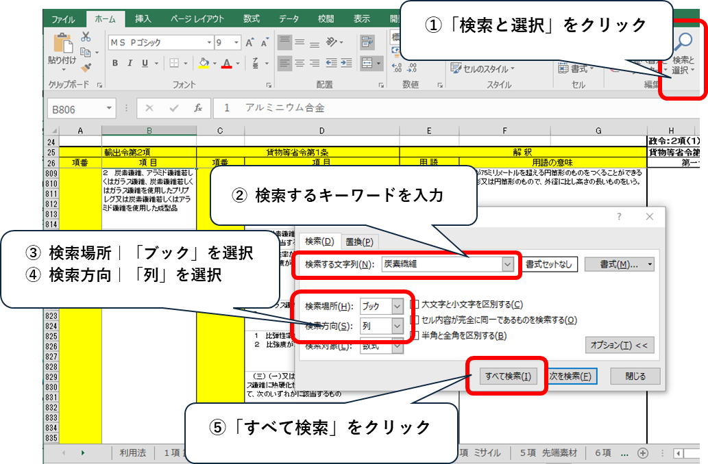 Excel の検索機能を活用し、マトリクス表から該非判定の対象の名称、関連 する用語及び類義語等で幅広く検索し、ヒットするか確認します。