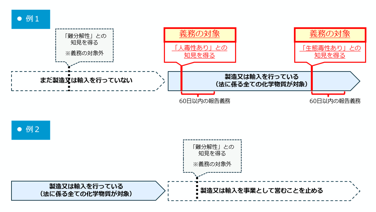 化学物質の審査及び製造等の規制に関する法律(昭和48年法律第117号。以下「法」という。)第41条に基づき、国における化学物質の審査や点検に活用できるよう、化学物質の製造又は輸入を行っている事業者は、その製造又は輸入した化学物質に関し、法の審査項目に係る試験や調査を通じて、難分解性、高蓄積性、人や動植物に対する毒性など、一定の有害性を示す知見を新たに入手した場合には、当該知見を得た日から60日以内に厚生労働大臣、経済産業大臣及び環境大臣への報告義務があります。