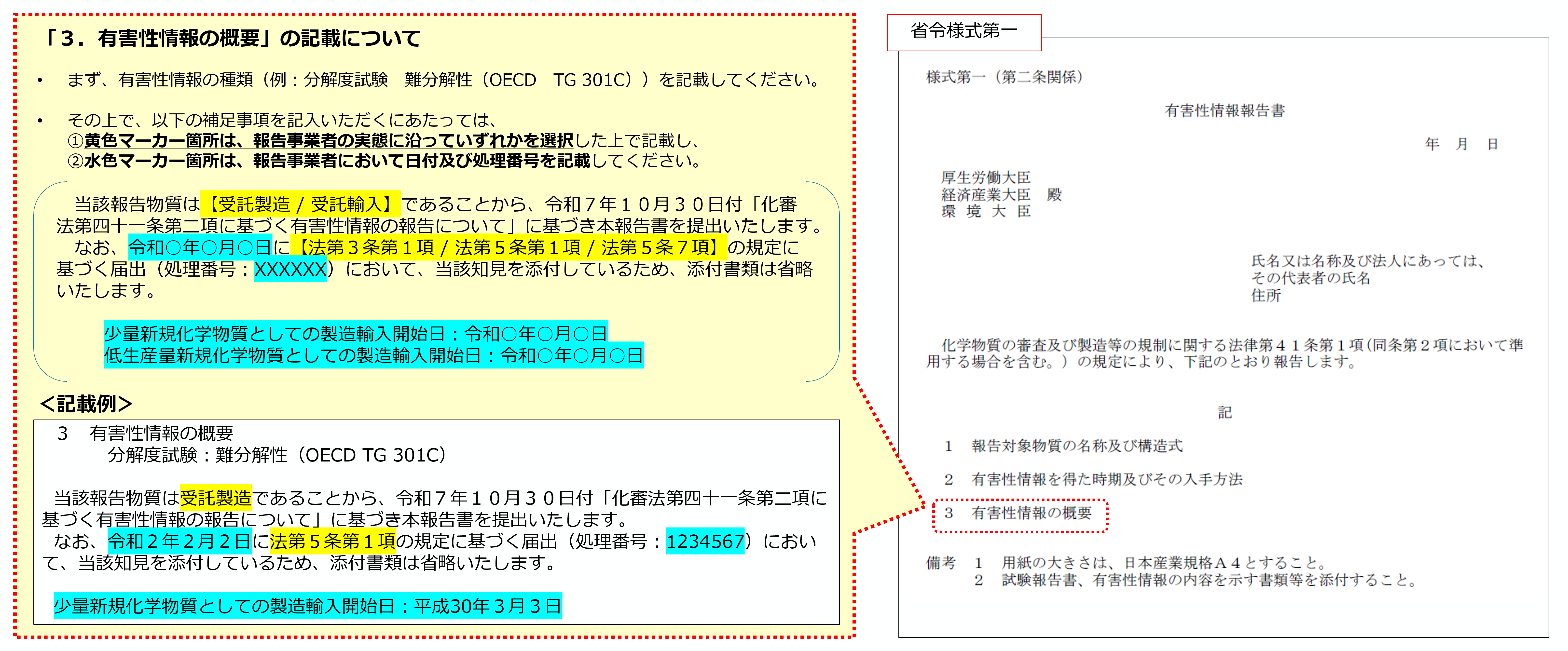省令様式の記載にあたっては、「化審法第41条に基づく有害性情報の報告に関する要領(令和7年9月)」をご確認ください。