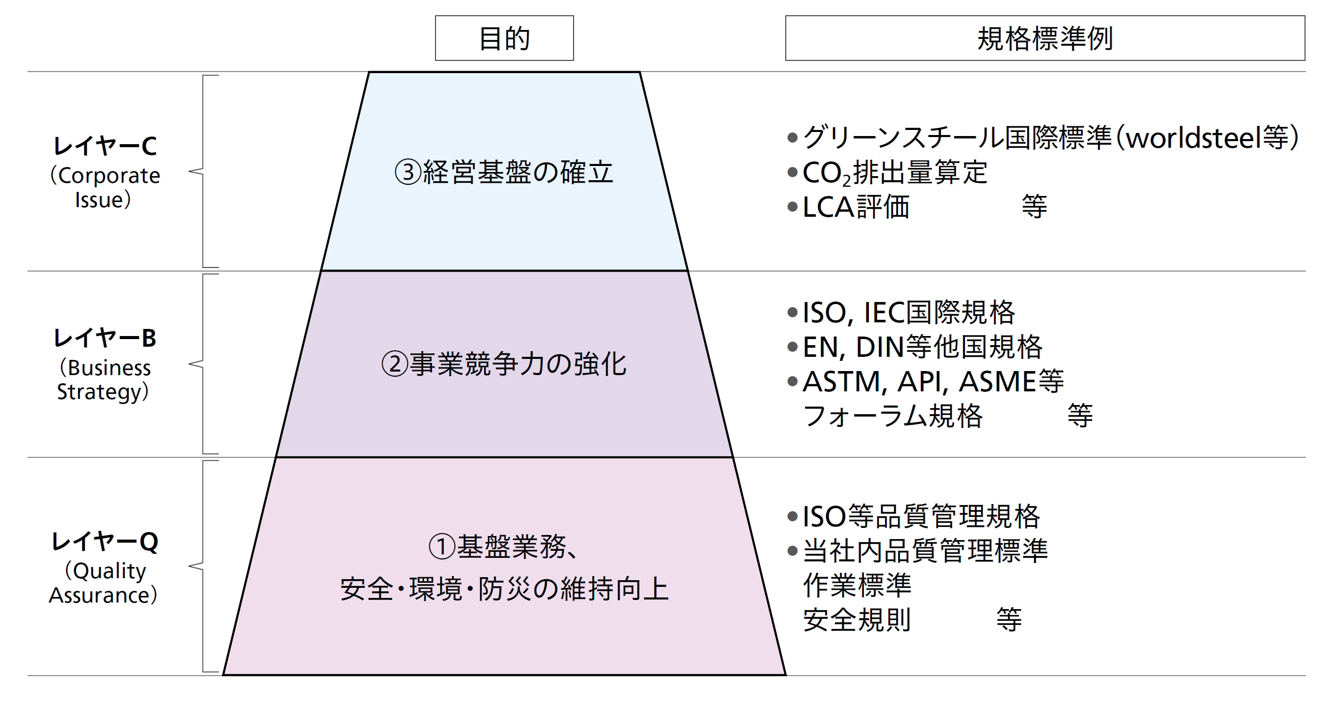 標準を日本製鉄の社内で活用するに当たって、佐々木氏が取り組んだことは、標準の役割を「レイヤーQ(基盤教務、安全・環境・防災の維持向上)」「レイヤーB(事業競争力の強化)」「レイヤーC(経営基盤の確立)」の3つのカテゴリーに分類、整理することであった。カテゴリー分けを行って各標準の役割が明確になったことにより、同社では社内の各部門が目的を共有しながら標準化を推進できる体制が整った。佐々木氏の中心領域はレイヤーBに位置づけられる技術・製品の国際規格化であるが、ISOの鉄鋼スマート製造規格のような産業界共通課題はレイヤーCに属する取組として推進している。