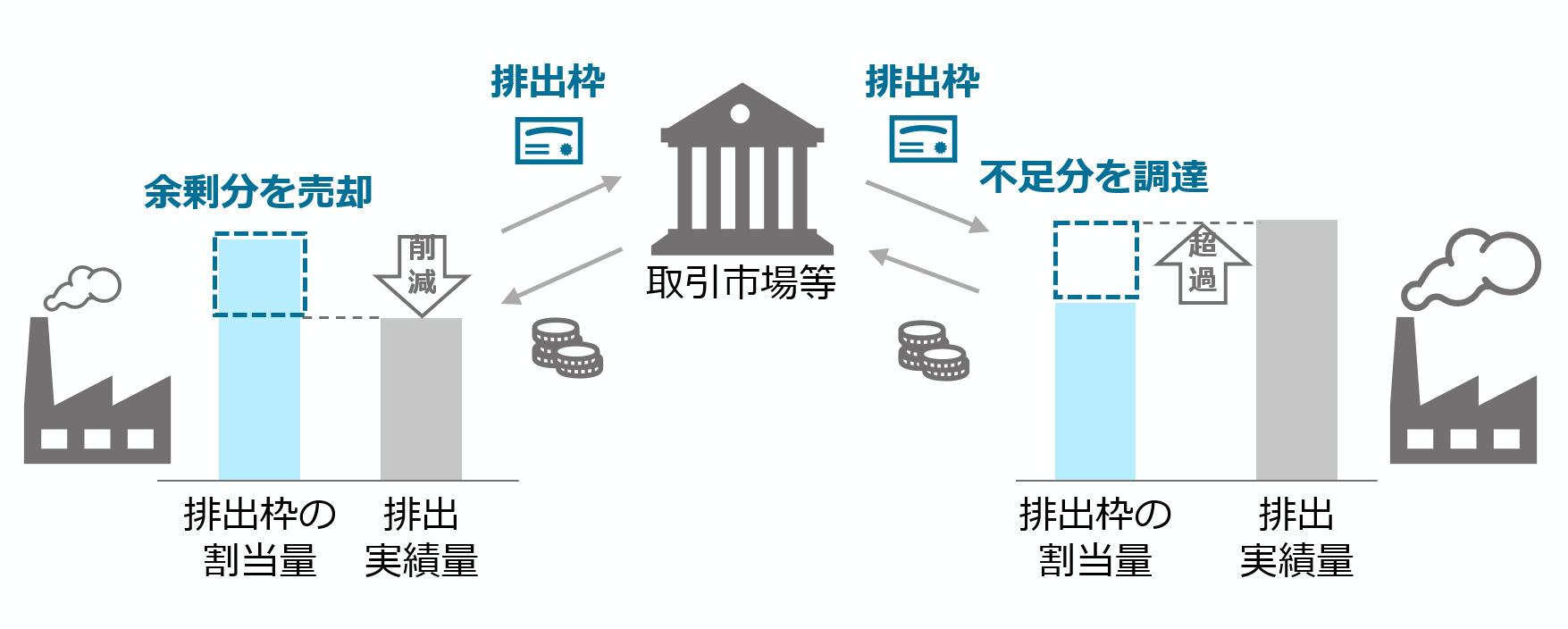 「排出量取引制度」では、政府が一定の基準の下、対象事業者に排出枠を割り当て、毎年度、排出実績量と同量の排出枠を法令に定める期限までに保有することを義務付けています。対象事業者は、排出枠の過不足に応じて、事業者間で排出枠を取引することができます。