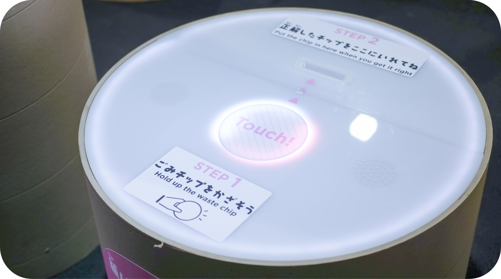 At the venue, visitors received a small “waste chip.” When they held it up to the correct box, it would light up — but if they chose the wrong one, a buzzer would sound. Both adults and children were drawn in, exclaiming, “Wait, there are this many kinds of bottles?” “This is harder than I thought!” and “This is so much fun!” as they eagerly took on the challenge.