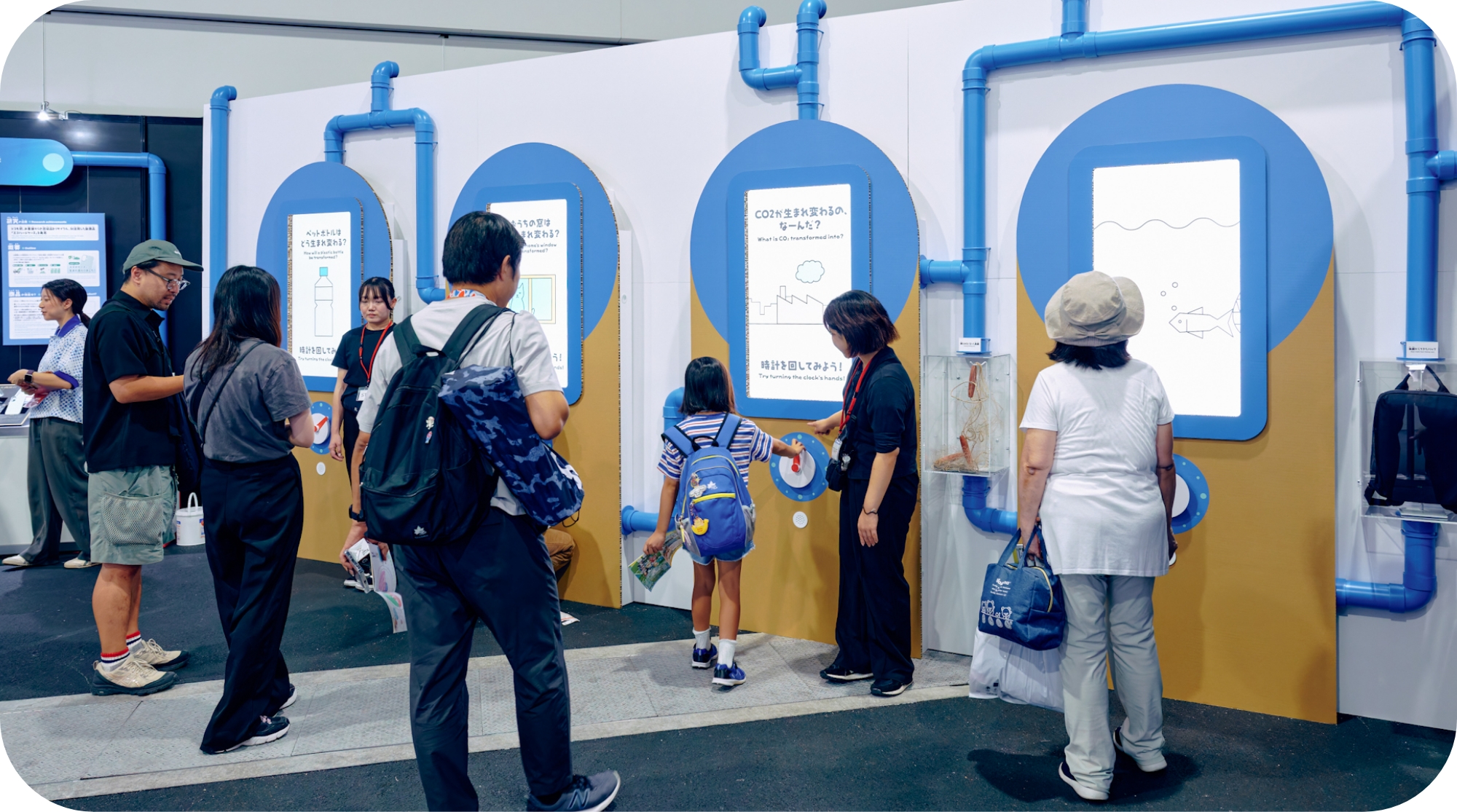 Visitors could turn a handle to experience how items look before and after being recycled. Other exhibits showcased surprising innovations — such as technology that collects carbon dioxide from the air to make carbonated drinks, and initiatives that transform discarded fishing nets from the sea into backpacks.