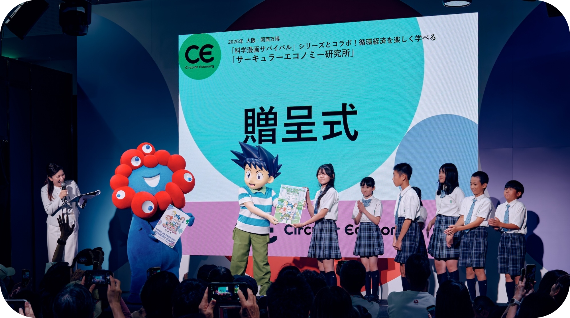 At the closing ceremony, Myaku-Myaku, the official character of Expo 2025 Osaka, Kansai, and Geo from the Survival Science Manga series, which collaborated with the Circular Economy Laboratory, joined the event to present students from Shijonawate Gakuen Primary School with learning booklets and a card game designed to make resource circulation fun and easy to understand. A student representative told the audience, “It became an unforgettable memory, along with a deeper understanding of the circular economy.”