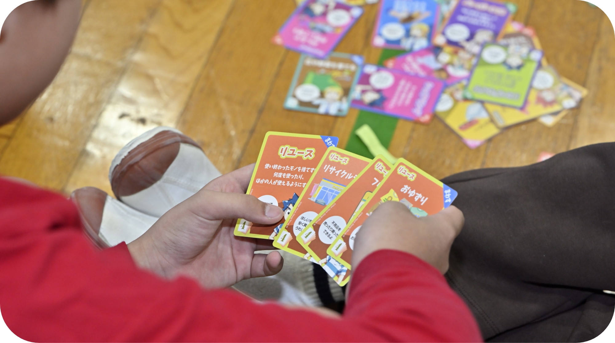 神宝小学的学生们仔细翻看小册子,很快就找到了对应的页码,这让讲师今井女士非常惊讶。带班老师们也加入其中,让卡牌游戏变得更加有趣。游戏结束后,孩子们摊开卡牌热烈讨论,“我已经做到再利用了哟”、“什么是本地生产本地消费”,并思考今后要采取的行动。