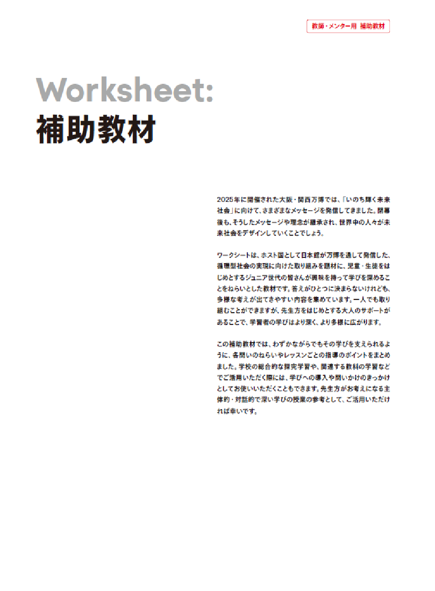 日本館レガシープロジェクトは、日本館の理念を次世代へ継承することを目的に実施しました。大学生と中学生から参加いただき、対話と共創を重ねながら、日本館のレガシーをジュニア世代へとつなぐアクションに取り組みました。日本館レガシープロジェクトレポートは、同プロジェクトに参加した学生の皆様の取組や気付きを取りまとめています。併せて公表するワークシートは、学生の皆様がプロジェクトを通して考えた問いをもとに、持続可能な未来について自ら考え、探求するための一助として活用できる教材です。学校や地域、個人など様々な場面でお使いいただけます。