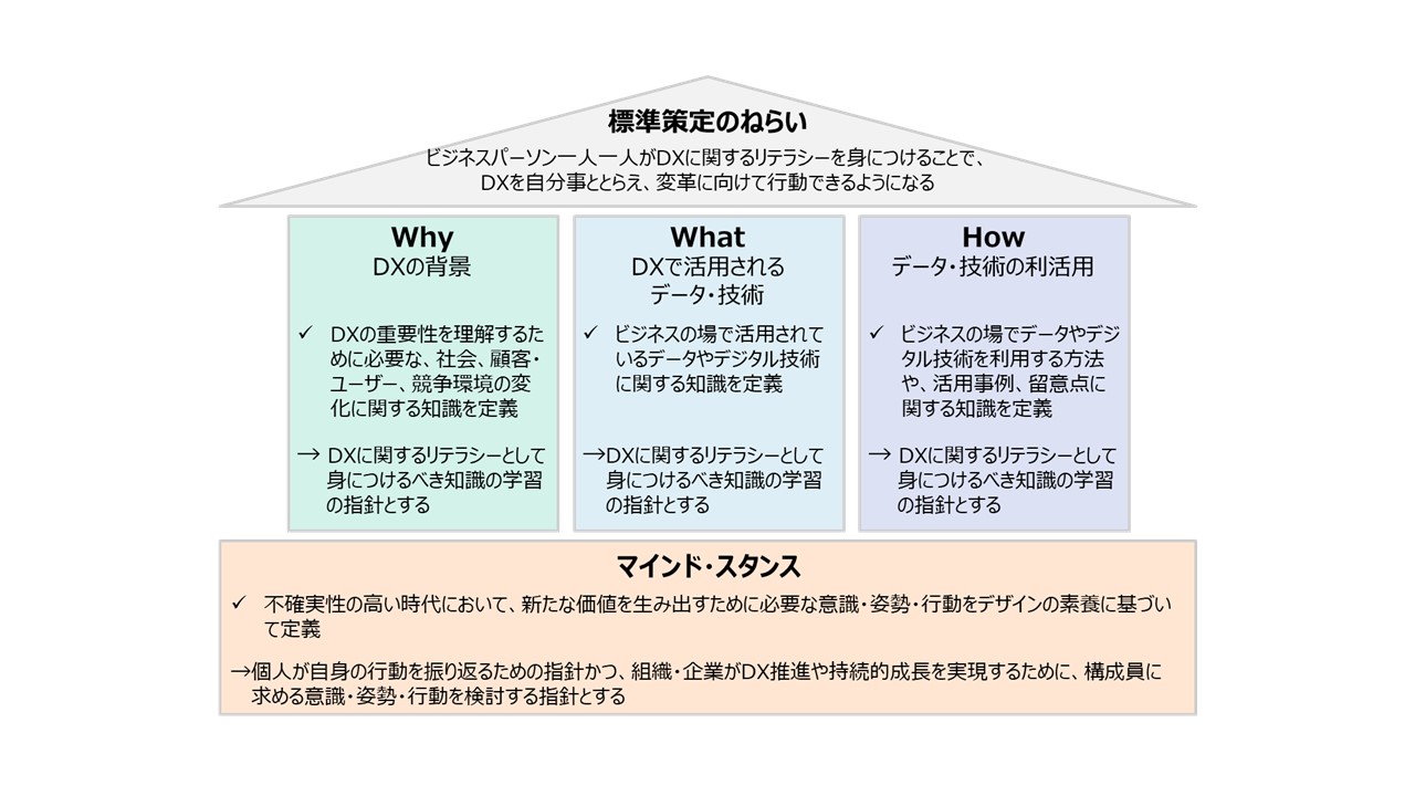 - 「DXリテラシー標準」:全てのビジネスパーソンが身につけるべきスキルを定義