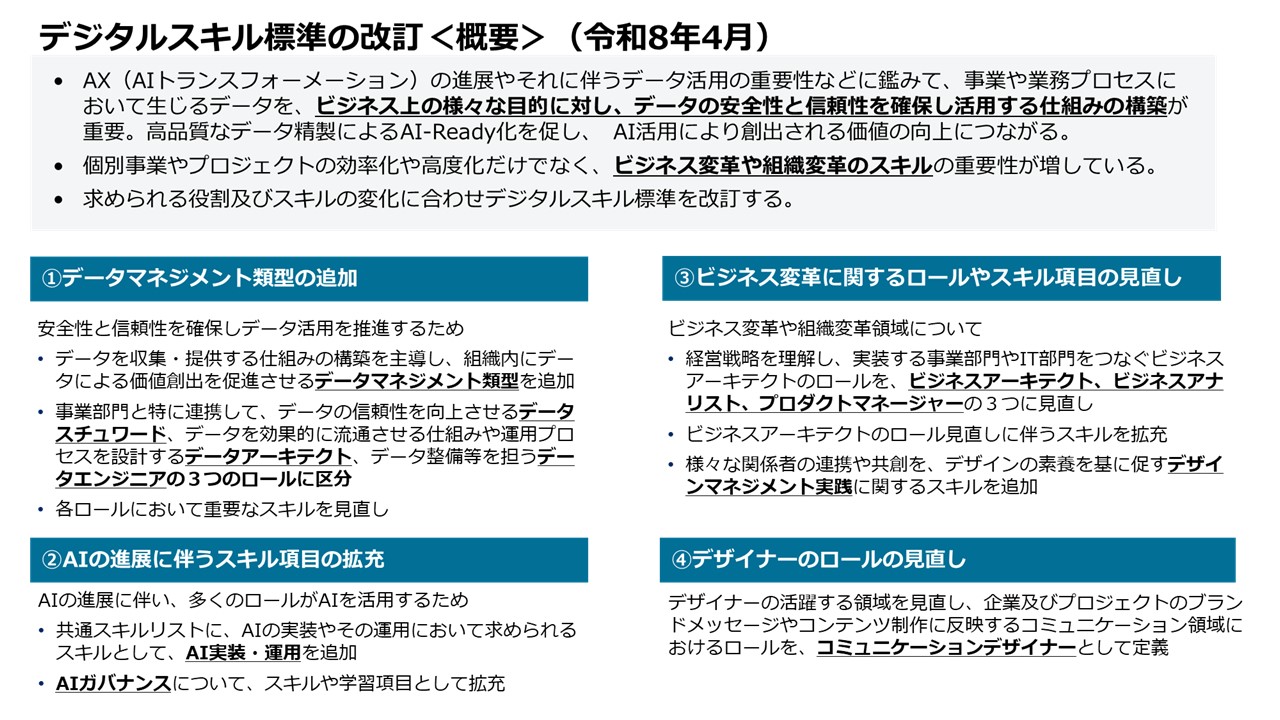 DXの実現に不可欠なテクノロジーとしてAI活用や、AX(AIトランスフォーメーション)が急速に進展する中、AI活用の前提となるデータ整備・管理・利活用を担う役割の重要性が一層高まっています。また、DXは個別の事業やプロジェクトにとどまるものではなく、ビジネスモデルや組織全体の変革を継続的に推進していく取組として捉えることが求められています。求められる役割やスキルの変化に伴い、令和8年4月にデジタルスキル標準のバージョン2.0(ver.2.0)を公表しました。具体的には、AXの進展やそれに伴うデータ活用の重要性などに鑑みてデータマネジメント類型を新設し、関連するスキルを見直しました。加えて、ビジネス変革を構想し、関係者を巻き込みながらDXを推進する役割とスキルについて、ビジネスアーキテクト類型やデザイナー類型におけるロールの見直し、及び関連するスキルの見直しを実施しました。