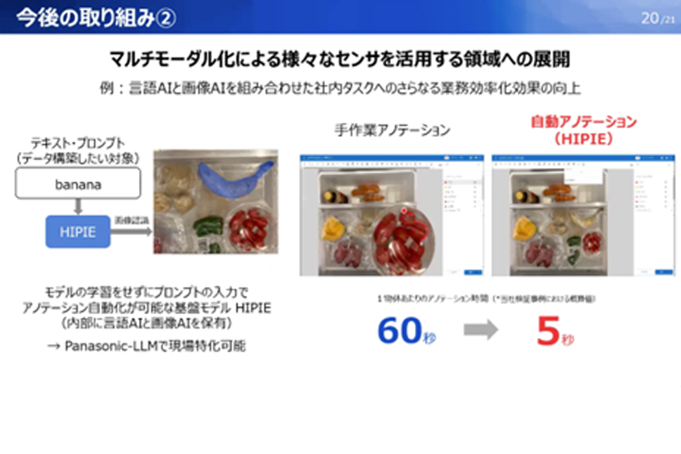 小塚:現在、Panasonic-LLM-100bはテキストフォーマットにしか対応していません。今後は、画像のフォーマットに対応したマルチモーダル化を進めることで、パナソニックの商品の視覚情報を自動で認識できるようにし、社内タスクのさらなる業務効率化につなげていきたいと考えています。すでに言語AIと画像AIを搭載した「HIPIE(ヒピエ)」の開発を進めており、Panasonic-LLM-100bと組み合わせることで、画像認識まで活用領域を広げていきたいと思っています。また、音声フォーマットにも対応できれば、工場内でのより便利な使い方も見えてきますし、先々まで見据えた開発を継続していく予定です。