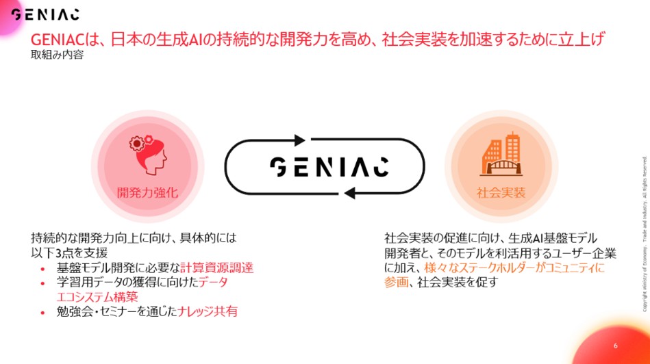 GENIACは、経済産業省とNEDOが実施する国内の生成AIの開発力強化および社会実装の促進を目的としたプロジェクトです。