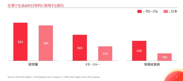 一方で、日本の現場における日常的な生成AI活用は依然として限定的であり、海外と比べても生成AIの現場への実装スピードに差が生じています。