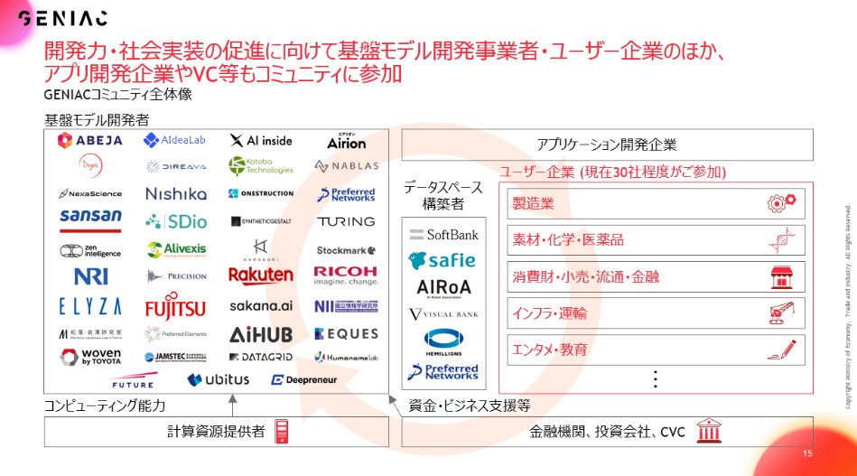 この取り組みの中で、生成AIに関わる開発企業、アプリケーション開発企業、ユーザー企業、計算資源提供者、VC・CVC・投資家など、多様なステークホルダーが参加するのが「GENIACコミュニティ」です。