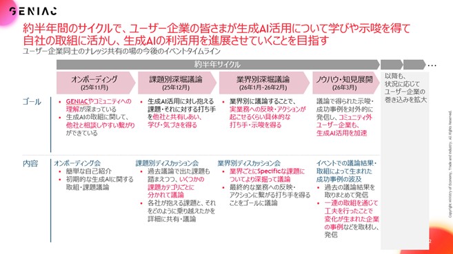 GENIACでは、企業の生成AI利活用を促進するため、ユーザー企業と共に生成AIの取組における課題解決に向けた半年間単位のロードマップを掲げています。