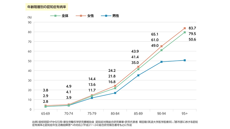 認知症の有病率は70歳を過ぎたころから95歳ごろにかけて急速に上がっていくと推計されています(朝日新聞社作成)
