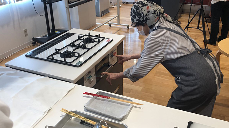 営業担当の中野さんや、リンナイ開発本部厨房機器設計室の加藤定基課長に連絡。「福岡オレンジパートナーズ」に参加する可否を検討するため、リンナイは福岡市が西部ガスのショールームを利用して開催した、認知症の当事者(軽度から中等度)を招いて行った調理会に参加しました。リンナイのガスコンロ「DELICIA(デリシア)」の最新型を使った調理の動作の観察です。