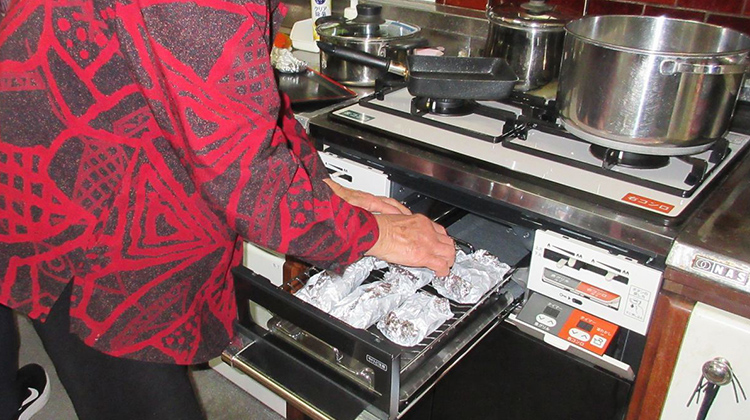 ![]() グリルで魚のホイル焼きをするデイサービスのご利用者(朝日新聞社撮影) |