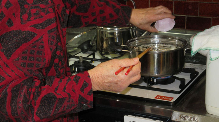 ![]() みそ汁を作るデイサービスのご利用者(朝日新聞社撮影) |