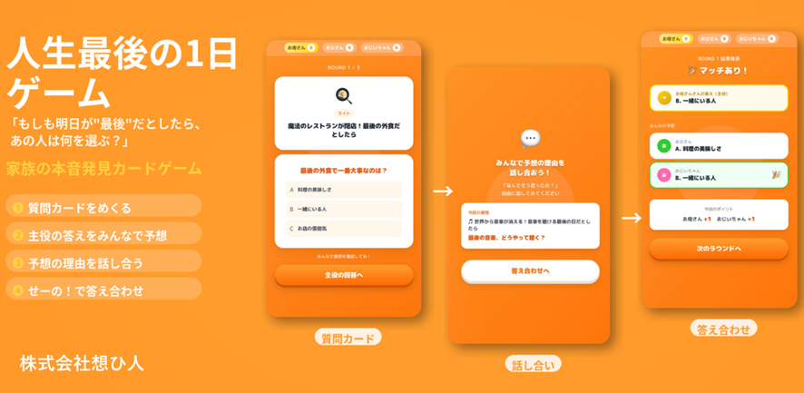 メンタリングでは、身構えずに家族とプレイでき、自然と家族の価値観を知ることができるようなゲームの設計や、手に取りやすいゲームの展開方法について議論しました。2回のテストプレイの結果、家族に対して「ゲームしようよ」と気軽に誘えて、意外な思いを引き出すことができるゲームができました。