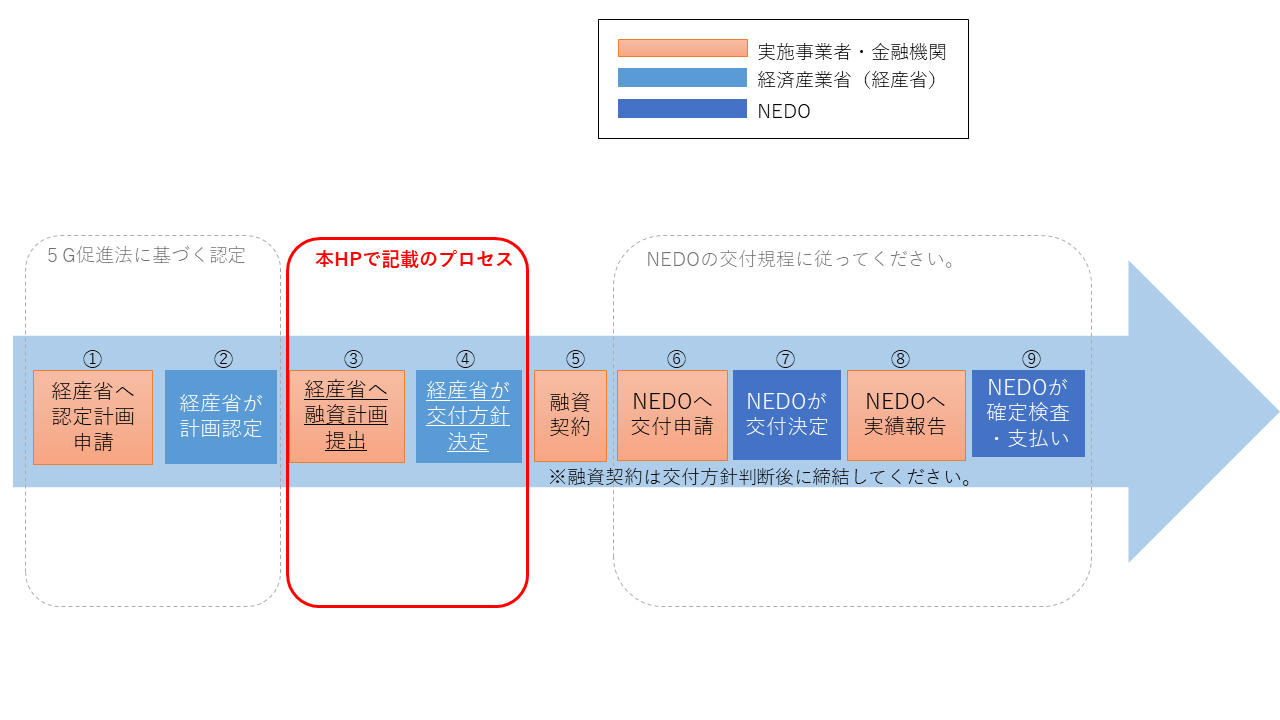 ・5G促進法*に基づいて認定を受けた特定半導体生産施設整備等計画について、認定を受けた事業者が計画の実施に必要な資金の貸付けを行う金融機関に対し、国立研究開発法人新エネルギー・産業技術総合開発機構(NEDO)が利子補給金を支給する支援措置です。・支援措置を受ける金融機関は、NEDOに交付申請をする前に、経済産業省による交付の方針の決定を受ける必要があります。