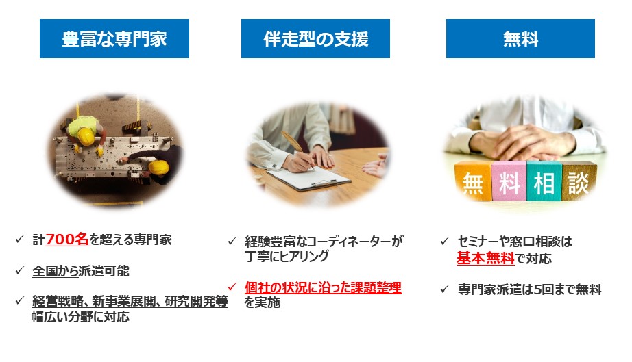 | 専門家の派遣 事業戦略の策定や技術開発、販路開拓等、個社の具体的課題に応じた専門家を選定し、伴走型の支援を実施。 |