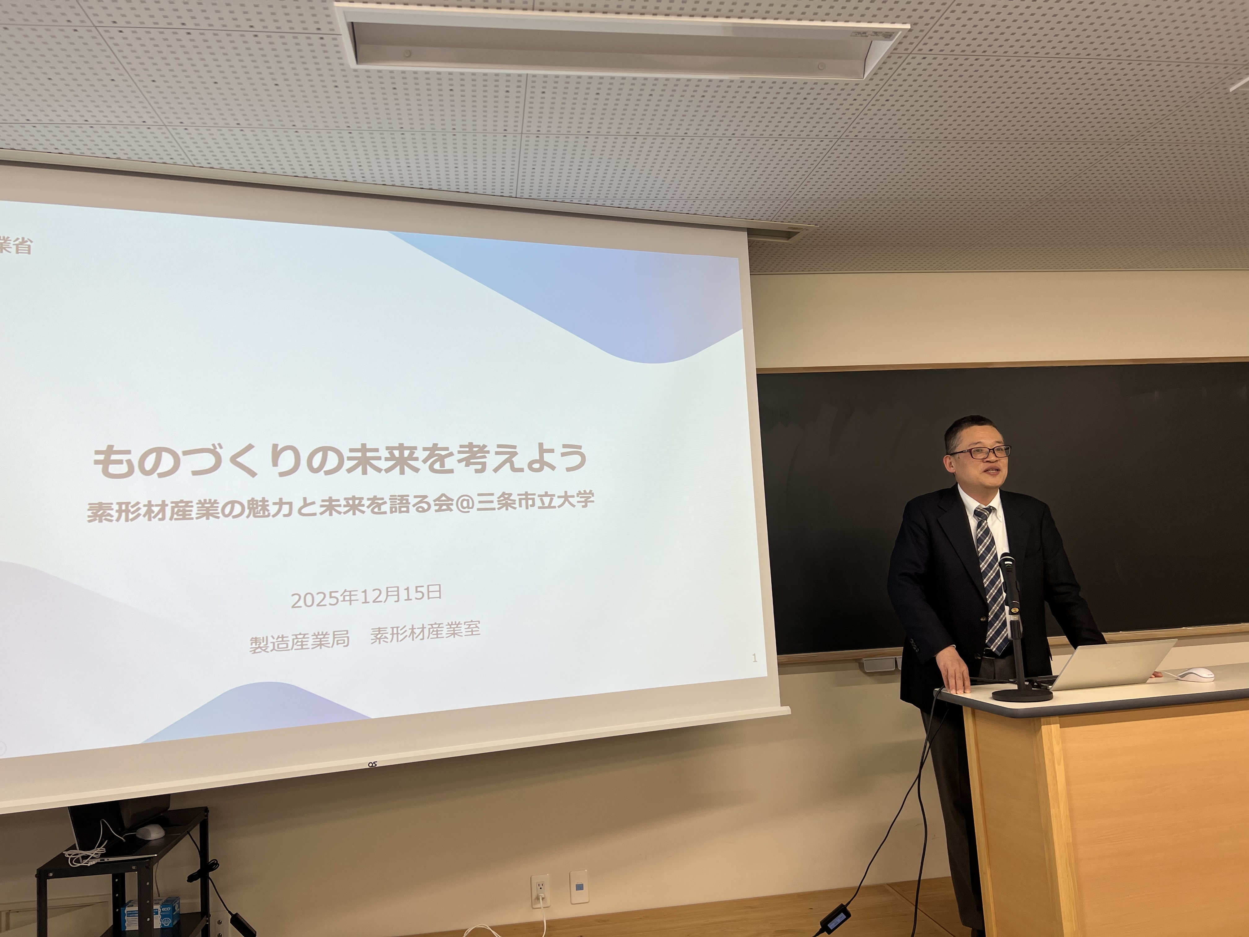 2025年12月15日、経済産業省素形材産業室は、新潟県の三条市立大学において、共和工業と協力して、地域における素形材産業の持続的な競争力維持・強化に向けて、金型の先進事例の紹介およびものづくりの将来を担う若手人材との意見交換を実施しました。