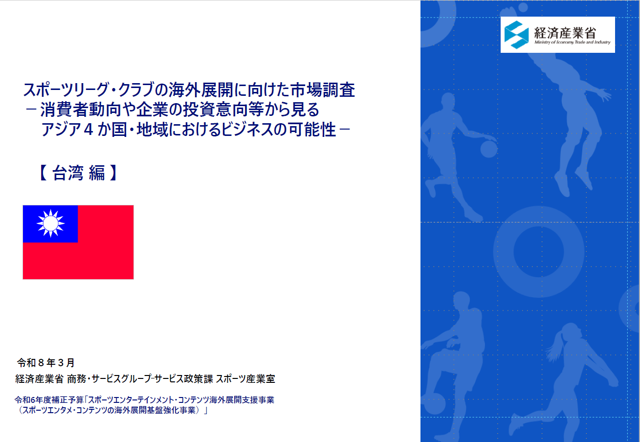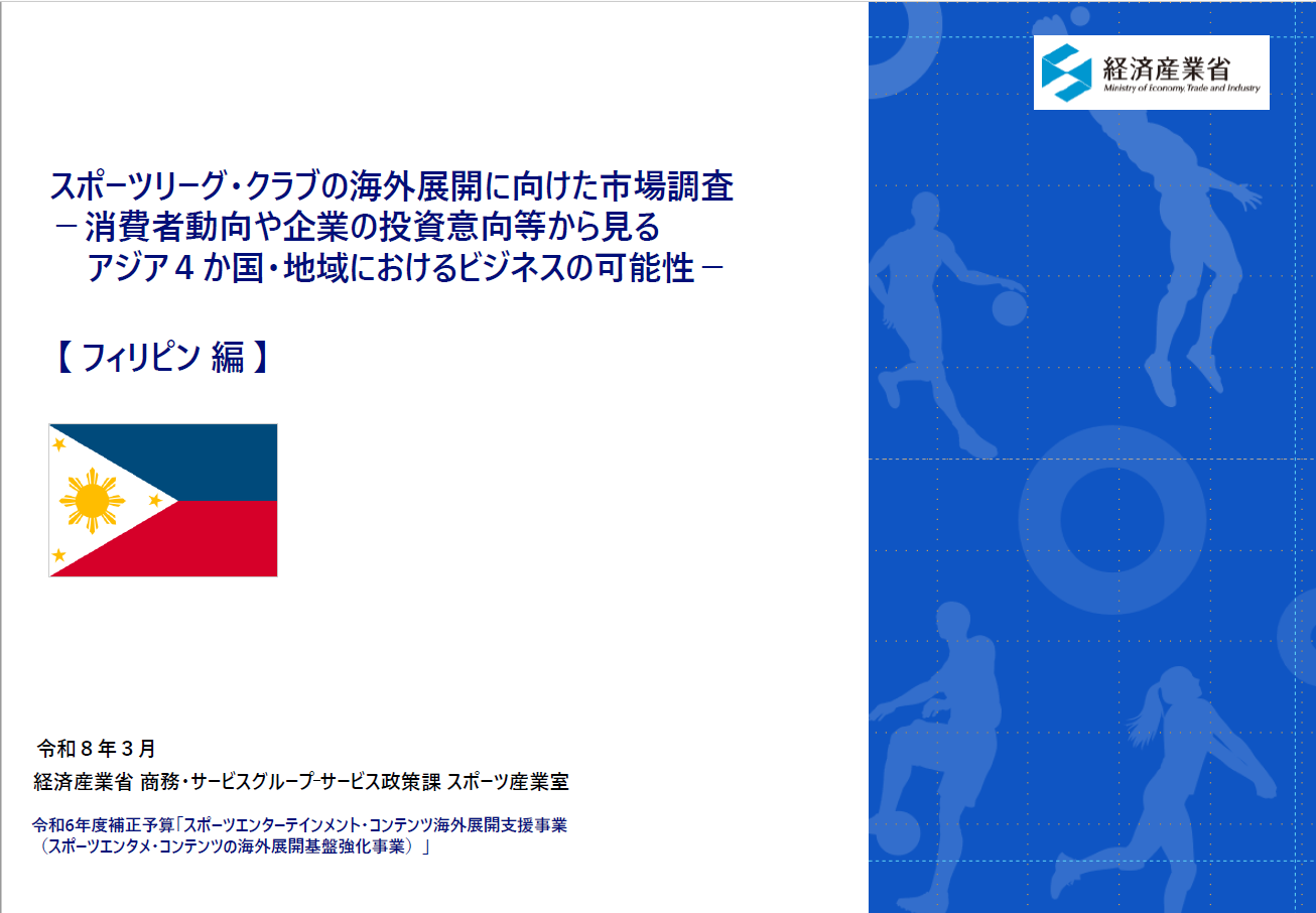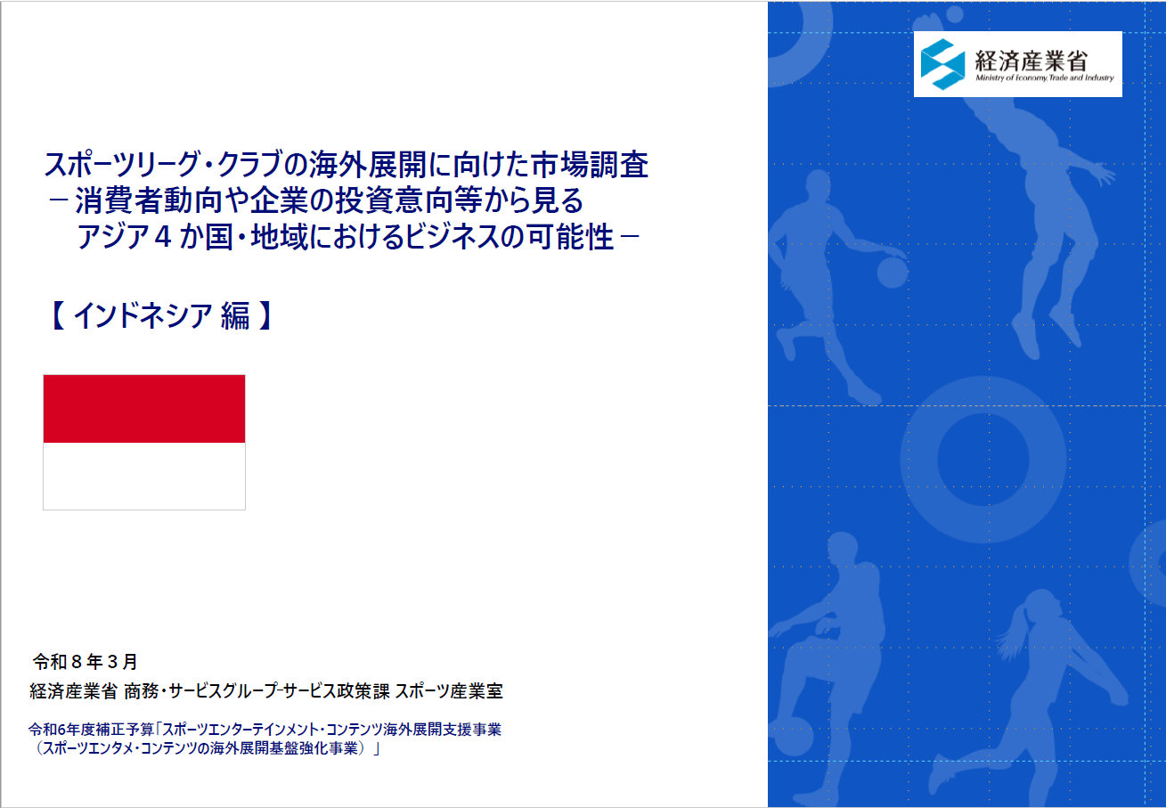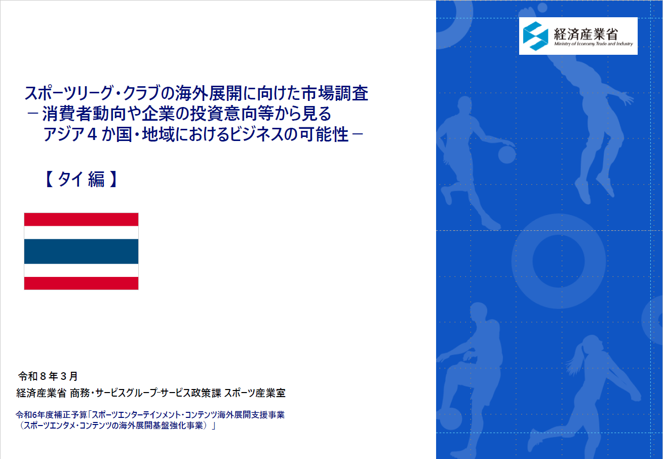 我が国のスポーツ産業は、「みる」スポーツの推進の観点から、国内ファンの拡大だけでなく、海外ファンの獲得など海外需要を視野に入れた事業展開が重要となってきています。 経済産業省では、こうした取組を通じて、スポーツ産業の成長産業化をさらに後押しするため、 主要トップスポーツリーグ・クラブのニーズや海外での活動状況等を踏まえて選定した、東南アジアを中心とする4か国・地域を対象に、現地嗜好や関心などを含む市場動向(商流や商慣習、現地ネットワークなど)、海外需要獲得に向けたビジネス展開に有用な情報を収集し、レポートにまとめました。調査レポート