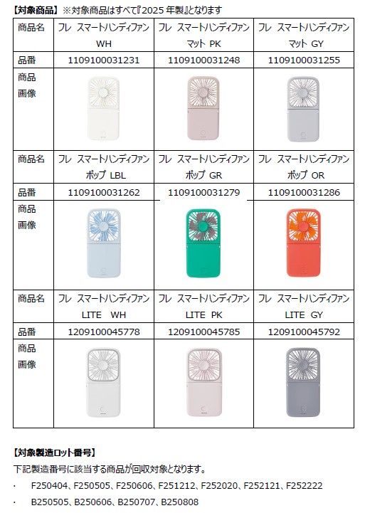 | 製品名 | 型番 | 色 | 品番 | 販売期間 | 対象台数 |