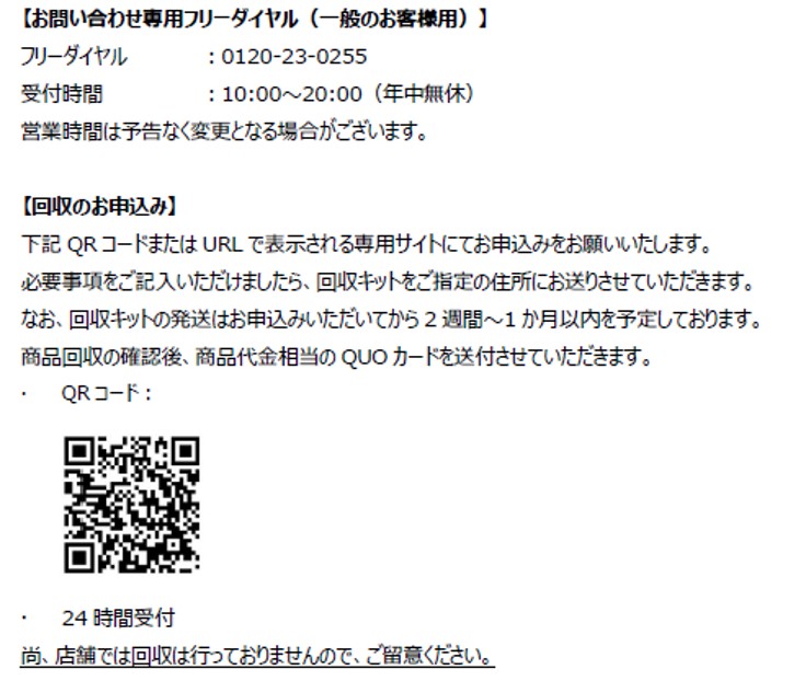 「自主回収専用受付フォーム」での回収・返金(クオカード)