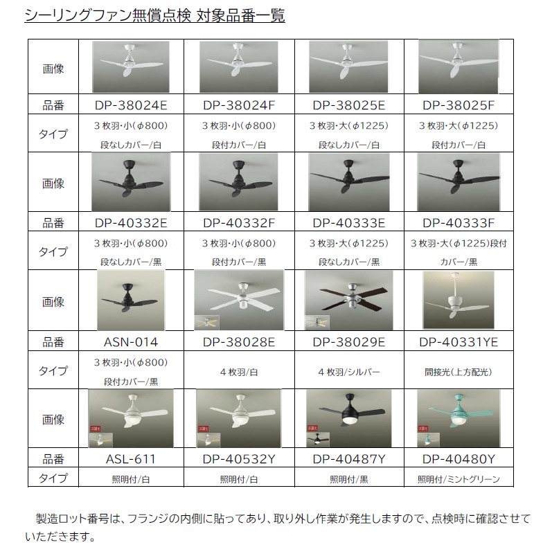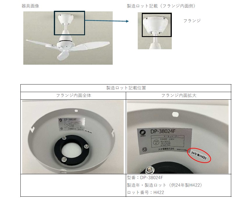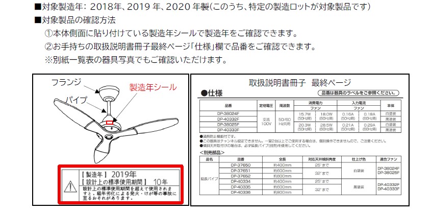 | シーリングファン | DP-38024E | 4955620713587 | 2019年1月7日~2020年6月24日 | 1,516台 |