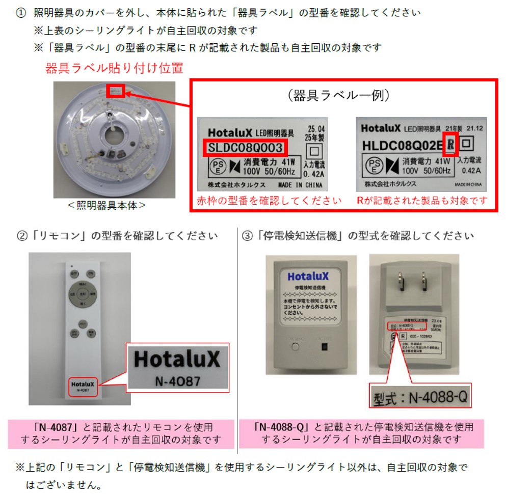 照明器具本体に内蔵された非常点灯用バッテリーから発煙・発火する可能性があることから、事故が発生することを未然に防止するため。