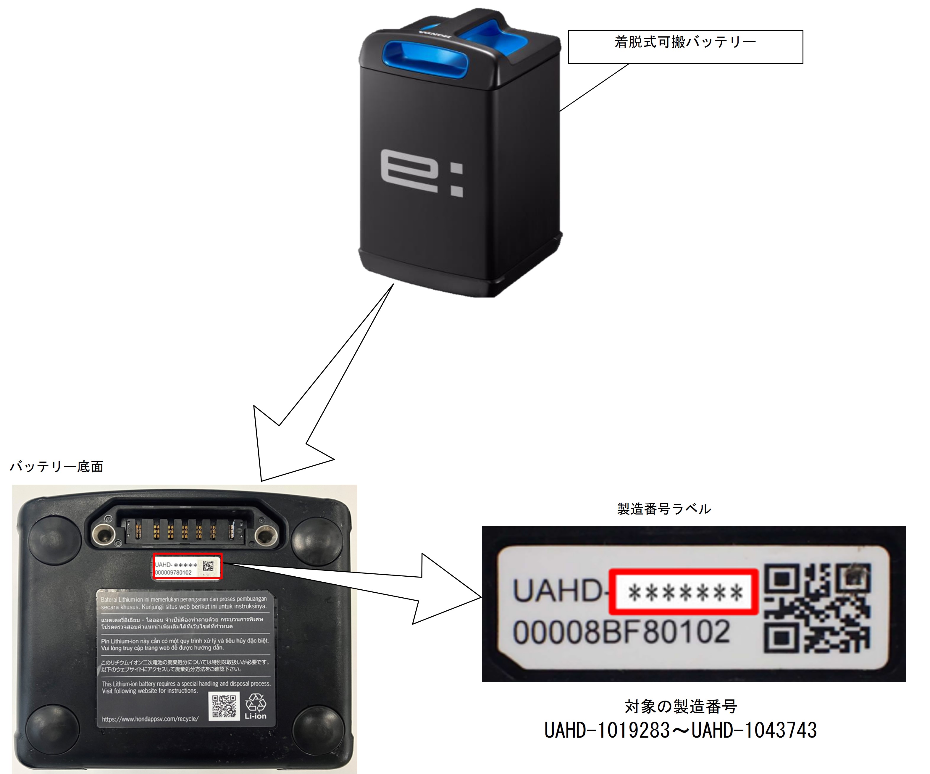 | 着脱式可搬バッテリー (Honda Mobile Power Pack e:) スーパー工業株式会社 リコール実施分 | UAHD-1039632~UAHD-1039643 | 令和5年3月15日 | 2台 |