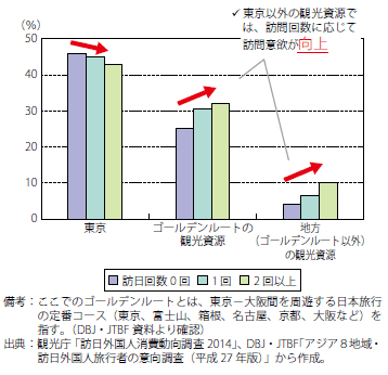 観光ビジョンにおいて、訪日数に関する目標だけでなくリピーター数に関する目標を設定している通り、長期的にはリピーター数を増加させていくことも必要である。近年、中国等のアジア諸国を中心に訪日客数が大幅に増加しており、その多くが新規に日本を訪れた方々であることを反映して、近隣国では香港、台湾、韓国、シンガポール・タイ以外の国は再訪率が約5割以下に留まっている(第Ⅱ-2-2-22図)ものの、我が国は長期的には更にリピーター数及び観光客数増加の余地があるといえる。また、二度目以降に我が国に来る観光客は地方へ訪問する意欲をもつ割合が高くなる(第Ⅱ-2-2-23図)ため、我が国へ再訪した観光客を上手く地方へ誘客していくことが重要となる。