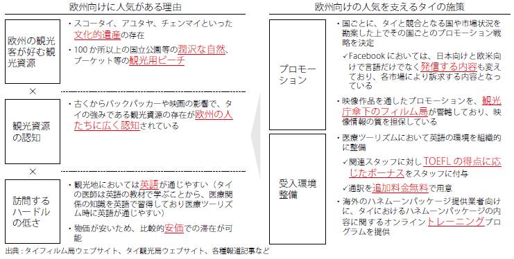 ここではタイの観光施策と観光産業の現状を見ることによって、我が国の観光施策の参考としたい。まず、タイは国ごとに、観光先として競合となりうる国や市場状況を勘案した上でプロモーション戦略を決定している。Facebookにおいては、日本向けと欧米向けで言語だけでなく発信する内容も変えており、各市場に訴求する内容となっている。そのほか宣伝などで使われる映像情報は、観光庁傘下のフィルム局が管轄しており、質を確保するための取込を行っている。