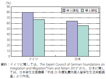 「統合と移住のためのドイツ諸財団専門家協議会」の調査によると、ドイツに留学し、修士課程で学んでいる留学生のうち約80%、博士課程の学生のうち約67%が、卒業後もドイツに残り、就職したいと回答している(第Ⅱ-3-2-32図)103。