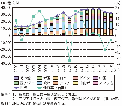 近年の世界における貿易の動向について概観していく。2016年の世界の財貿易額は31兆9,128億ドルで前年比▲3.8%と2年連続で減少した。貿易額の伸び率の推移を見ると、2008年以前は毎年前年比+10%を越える成長を続けていたことがわかる。しかし、世界経済危機が起こった後、大きく貿易額が落ち込んだ反動で一時的に高い伸び率を見せたものの、2012年以降その伸び率は大きく鈍化し、2015年には遂にマイナス転化した(第Ⅰ-1-3-1-1図)。