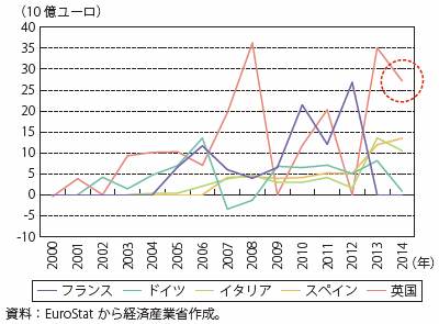 英国の経常収支は米国と同じく恒常的に大幅な貿易赤字を抱えている一方で、サービス収支の黒字額が拡大を続けており、貿易による赤字額を補填する形となっている。サービス収支と第一次所得収支は2000年代初頭から急激に黒字額の拡大を始め、サービス収支では英国の主要産業の一つである金融とその他業務サービスが、第一次所得収支では直接投資収益が黒字額拡大の牽引役となった(第Ⅰ-1-3-2-7図、第Ⅰ-1-3-2-8図)。