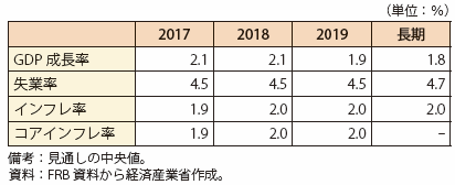 2017年3月に行われたFOMCでは、FF金利誘導目標が0.75%~1.0%へと再び引き上げられた。併せて発表された経済見通しでは、2017年の実質GDP成長率は2.1%、失業率は4.5%、インフレ率及びコアインフレ率28は1.9%とされ、経済活動が引き続き緩やかに拡大する中で労働市場は力強さを増し、インフレ率は中期的に2%程度で安定するとの見通しが示された。雇用が堅調に伸び、インフレ率が2%の目標へ向かって回復する中で、現時点では2017年末までに更に2回の利上げが見込まれている(第Ⅰ-2-1-1-5図、第Ⅰ-2-1-1-6表)。