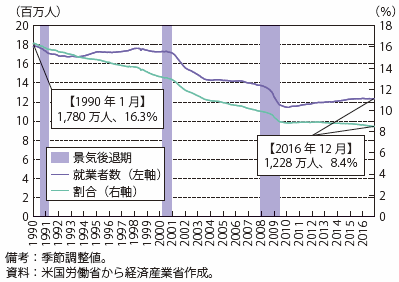 失業率については米国全体でおおむね改善傾向にあり、2016年は41州で低下又は横ばいとなったが、9州では上昇が見られた。地域別では中西部地域が最も失業率が低く(4.7%)、西部地域が最も高かった(5.1%)が、前年からの低下幅は反対に西部地域が最も大きく(0.6%ポイント減)、中西部地域が最も小さかった(0.1%ポイント減)。