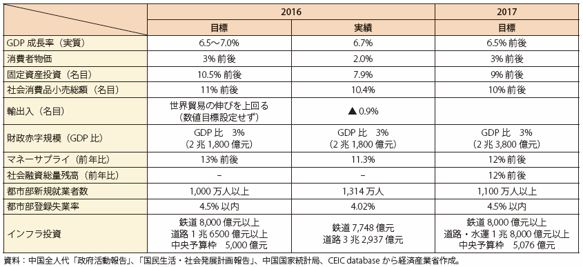 2016年は、実質GDP成長率等は景気支援策の効果もあり目標を達成した(第Ⅰ-3-1-14表)。ただし、個別項目では小売売上高がほぼ目標どおり伸びる一方で、固定資産投資は目標を下回った。2017年は、実質GDP、固定資産投資、小売売上高等の目標を2016年よりも低めに設定する一方で、新規雇用者数の目標は引き上げて雇用を重視している。金融政策は「穏健中立」としているが、金融リスクや資産バブルを警戒してマネーサプライの目標は小幅ながら引き下げた。財政赤字やインフラ投資は前年並みの水準として、引き続き、景気支援策を続ける方針がうかがえる。2017年は5年に1度の共産党大会を秋に控え、景気支援策を続けながら経済成長を安定させる姿勢が見受けられる。