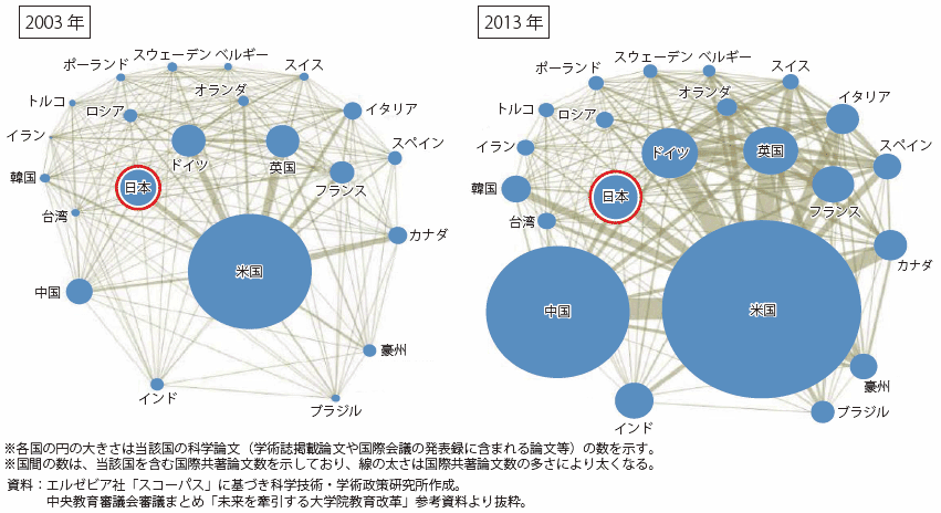中国が急速に共同研究を伸ばしている理由の一つとしては、留学生の存在が挙げられる。米国等に留学した中国人は帰国後も引き続き、留学をしてきた国との共同研究を行うことがあり、これによって中国は急速に共同研究を伸ばしてきたことが考えられる93。