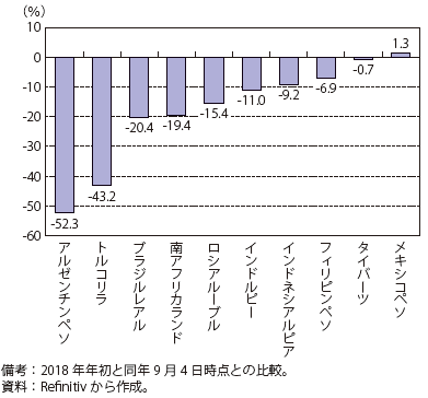 (第Ⅰ-2-1-5図)は、2018年8月のトルコ・ショック7発生直後の9月初旬時点のアルゼンチンペソとトルコリラを含む主要新興国通貨の2018年の年初来の騰落率の比較を示す。これによると、アルゼンチンペソとトルコリラが他の通貨に比べて大きく下落したことがわかる。