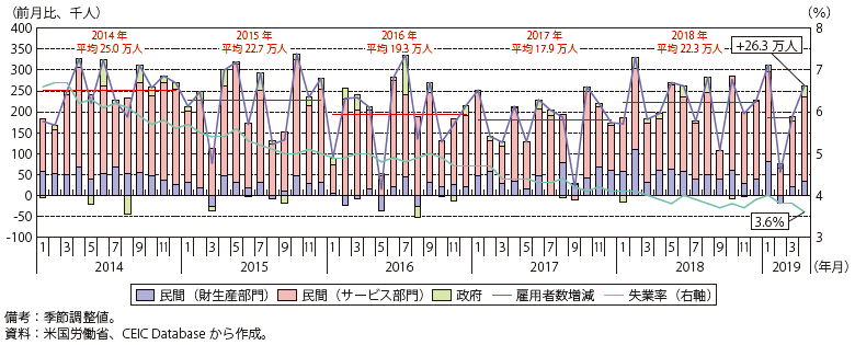 2018年の各月の非農業部門雇用者数は、平均で22.3万人伸びている(2017年平均:17.9万人)。イエレン前米国連邦準備制度理事会(FRB)議長は、失業率を長期的に安定させることができる雇用増加の水準を1か月あたり7.5万人から12.5万人としており43、2010年以降はこの水準を大きく上回るペースでの増加が続いている。失業率についても、2019年4月に1969年12月以来、過去50年で最低となる3.4%を記録し、2018年の平均でも3.8%と極めて低い水準を維持している44(第Ⅰ-3-1-4図)。