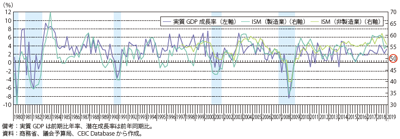 46 1949年以降の実質GDP成長率とISM製造業指数の相関でみれば、例えば、2019年3月のISM製造業指数の55.3の水準は、3.7%程度の実質GDP成長率が見込まれる数値である(第Ⅰ-3-1-11図)。