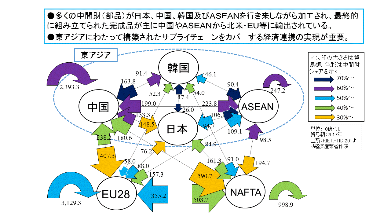 東アジア地域では、既に高度なサプライチェーンが構築されている(第Ⅲ-1-4-4図)が、この地域内における更なる貿易・投資の自由化は、地域経済統合の拡大・深化に重要な役割を果たす。