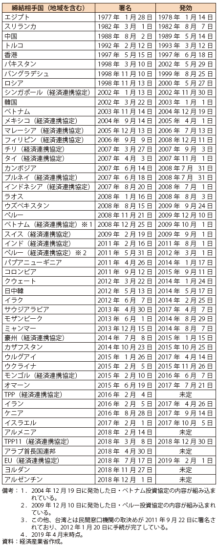 我が国は、1978年、エジプトとの間で初の投資協定が発効し、以降、これまで重要な経済関係を有するアジア地域の国々を中心に、投資関連協定を締結してきた。現在、48件の投資関連協定に署名し、うち43件が発効している。(2019年3月現在)(第Ⅲ-1-5-4-1表)。我が国は比較的近年になってから投資関連協定の締結に取り組んできたが、産業界のニーズや相手国の事情に応じながら、新規協定の締結及び既存協定の改正に向けた交渉を一層積極的に進めていく必要がある。