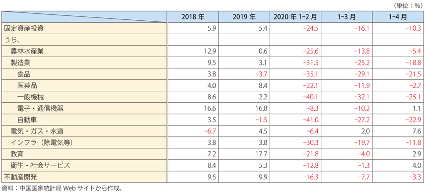 2019年の工業生産の伸び率は、月別の振れはあるものの、緩やかに低下しており、2019年全体としては前年に比べて小幅ながら鈍化した(第Ⅰ-3-3-3図)。2020年に入ると1-2月の伸びが2桁台のマイナスに転じた。月次統計で遡及できる1995年以来のマイナスであり、2008年の世界金融危機で落ち込んだ時ですら、プラスを維持したことに比べれば影響の大きさがうかがわれる。感染症の影響で春節明けから人の移動が規制され、帰郷した農民工が戻れず、また資材調達にも支障が生じて、工場の操業に影響が出たためと見られる。3月になると工場の操業が次第に再開され、食品、医薬品などの必需品や電子・通信機器等を中心に持ち直しの動きが見られ、さらに4月には主要業種の伸びはプラスに転じた(第Ⅰ-3-3-4表)。